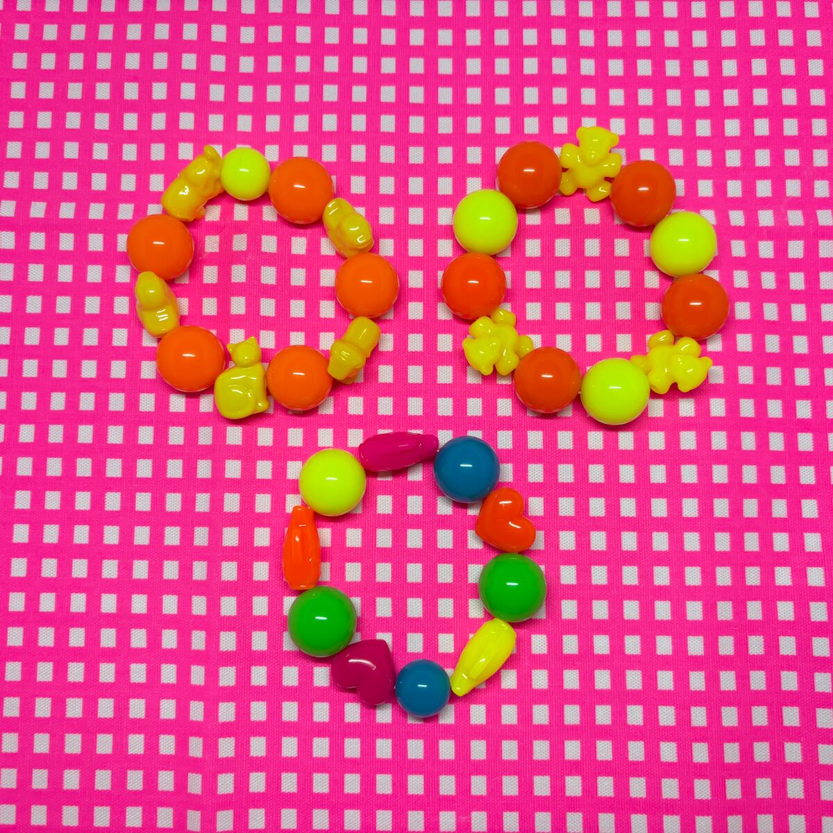 動物や魚やハートなど、カラフルなビーズを組みあわせた元気の出る大ぶりブレスレット☆